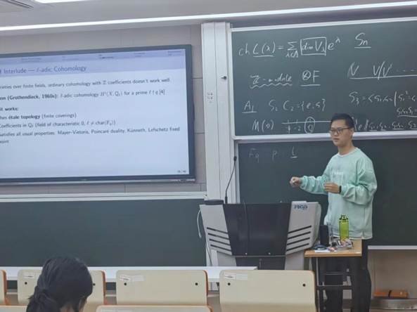 随后,老王论坛 2024级拔尖班的肖倍达同学作了题为“Kazhdan-Lusztig Deligne-Lusztig: Geometry Meets Representation Theory”的报告。报告介绍了群和代数表示论中的Kazhdan-Lusztig和Deligne-Lusztig理论,阐述了两种理论如何分别从李代数表示和有限李型群表示的角度利用代数几何的语言来研究表示论的问题。