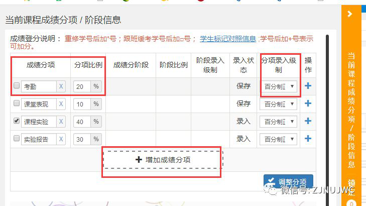输入完成后勾选其中一项(须是期末成绩项),再点“调整分项”保存。