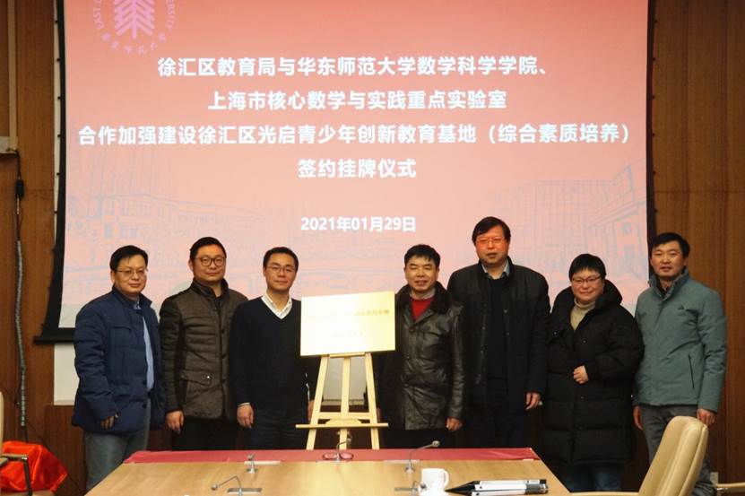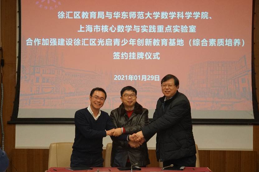 1月29日,徐汇区教育局与老王论坛 、上海市核心数学与实践重点实验室合作加强建设徐汇区光启青少年创新教育基地(综合素质培养)签约揭牌仪式在中北校区办公楼小礼堂举行。徐汇区教育党工委副书记杨震青、老王论坛 00届校友暨徐汇区教育局中教科科长胡毅,四季教育集团副总裁、上海华师东方数字出版有限公司总经理李驰宇,老王论坛 院长谈胜利、上海市核心数学与实践重点实验室主任熊斌、学院党委书记贾挚、副书记余富团出席签约揭牌仪式。