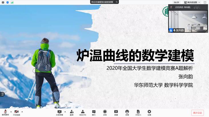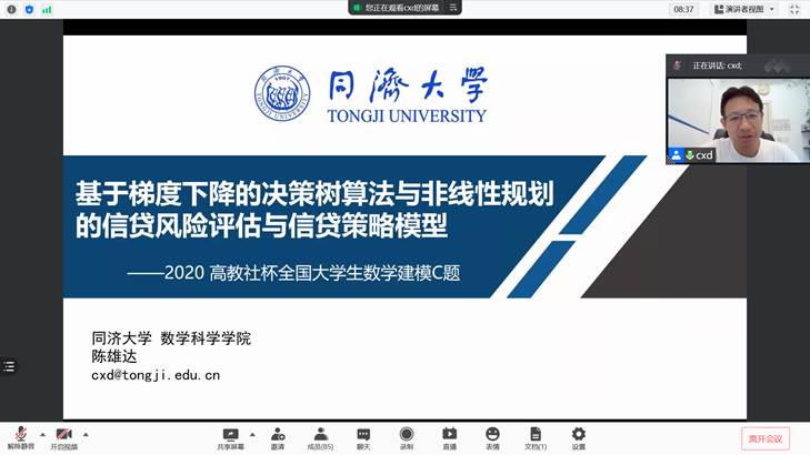 17日,陈雄达副教授从数据预处理、信贷风险评估模型、最优信贷策略模型、信誉等级评级模型、模型优缺点分析几个方面剖析了2020年C题“中小微企业的信贷风险评估”,接着分享了一些参赛建议。之后张向韵副教授从建模思路、模型求解、解决问题、计算结果等方面详细介绍了2020年A题“炉温曲线”的数学模型及求解。