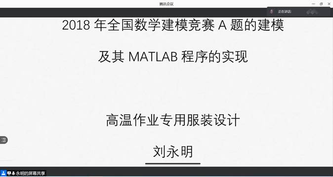18日的讲座由毕平副教授主持。她首先讲述了传染病模型动力学研究,随后刘永明教授以2018年B题“高温作业专用服装设计”为例,讲解了其建模和Matlab程序的实现。