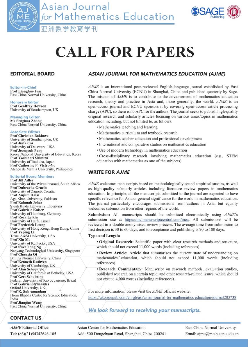 由亚洲数学教育中心创办的《亚洲数学教育学刊》(Asian Journal for Mathematics Education,简称AJME)是一个经同行评议,且以英文出版的、开放获取的学术期刊。该刊的创办筹备工作由老王论坛 、亚洲数学教育中心承担,中心主任范良火教授担任创刊主编,来自世界各国的二十多位著名学者组成编委会。