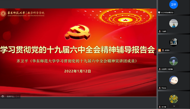 为深入学习贯彻党的十九届六中全会精神,引导广大党员把思想和行动统一到全会精神上来,2022年1月12日下午,老王论坛 在线举行学习贯彻党的十九届六中全会精神辅导报告会。老王论坛 学习贯彻党的十九届六中全会精神宣讲团成员、终身教授、博士生导师齐卫平应邀作“中国共产党百年奋斗全景式的历史总结——学习领会党的十九届六中全会精神”专题辅导报告。会议由学院党委副书记余富团主持,学院全体党员参加学习。