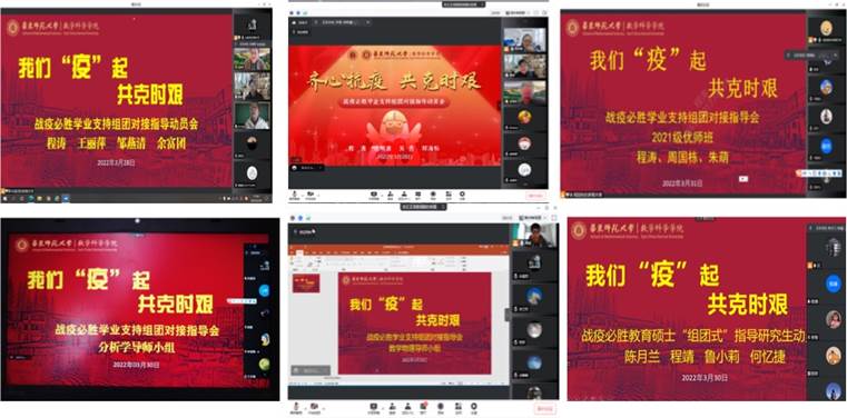 守土有责、守土负责,随后,研究生、本科生分条线分别召开了“学业支持组团对接指导动员会”、“博士毕业生导师指导研究生就业动员会”、“导师团队指导研究生动员会”、“硕士二年级学业支持指导小组动员会”、“硕士一年级学业支持组团对接指导动员会”,再发动再动员。党员带头、全员参与,老师们纷纷启动指导活动,“博士生毕业论文与就业要双管齐下、两不误”,“闷在宿舍不舒服,要多跟导师联系,发泄出来会好很多”,“研究卡壳的时候,随时跟导师沟通”,“数学分析的教学辅助材料都上传到超星大夏平台上了,如果没搞清楚怎么用,我下次再给大家讲一讲”……老师们纷纷给学生支招。截止目前,全院已开展线上组团对接指导活动10余场,本周将完成近20场活动。学院党委将持续推进活动开展,加强考核,直至战疫取得胜利。