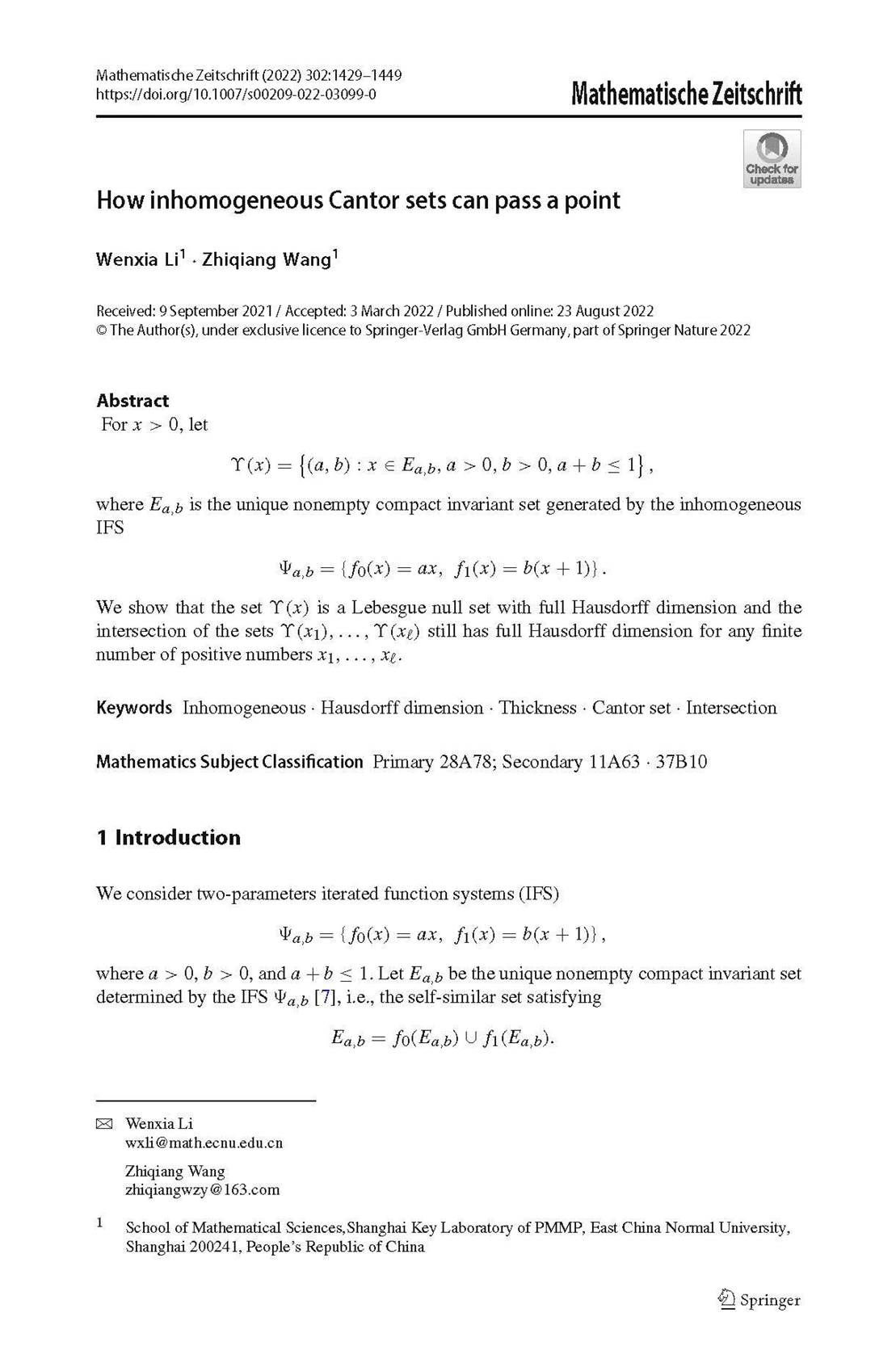 成果2简介:研究论文“How inhomogeneous Cantor sets can pass a point”发表于Mathematische Zeitschrift。论文考虑一族双参数的非齐次迭代函数系统的不变集,证明了一些参数构成的集合是Lebesgue零测集,但具有满的Hausdorff维数,并且有限个集合的交仍然具有满的Hausdorff维数,这些结论还可以得出许多有趣的性质。