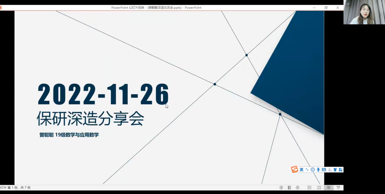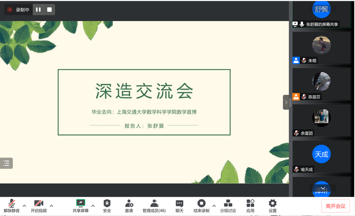 第二位进行分享的是保送到本校数学专业读研的2019级拔尖班学生周家乐。他介绍了本校推免的程序,告诉同学们要通过劳逸结合来提高学习效率。周家乐还建议同学们在疫情下保持良好的作息方式,多与同学和老师沟通。