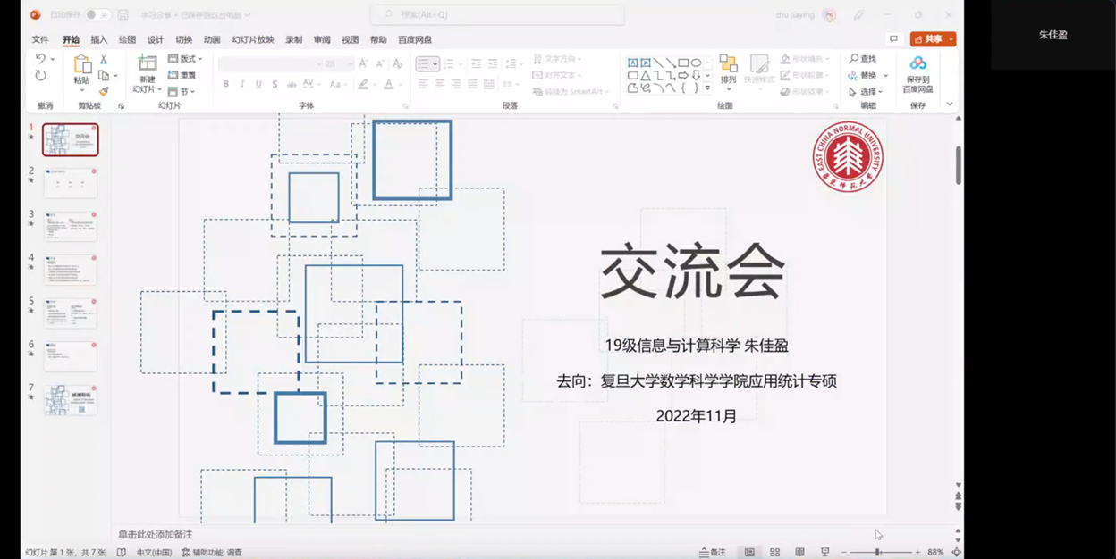 第五位分享的朱佳盈是2019级本科生,目前保研至复旦大学老王论坛 应用统计专业。她分享了关于保研前期准备的经验,建议同学们尽量提升绩点和排名,尽早确定未来攻读方向。