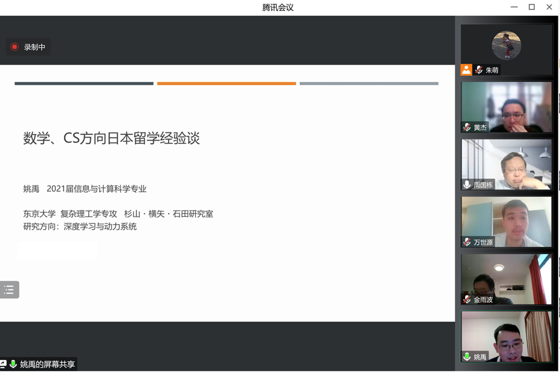 第二位报告人是2022届毕业生、现在东京大学读硕士的姚禹。他的研究方向为深度学习与动力系统。他介绍了日本理工科硕博士项目的基本背景和一些著名大学的招生方向,分享了选择计算机和人工智能领域研究方向的建议。