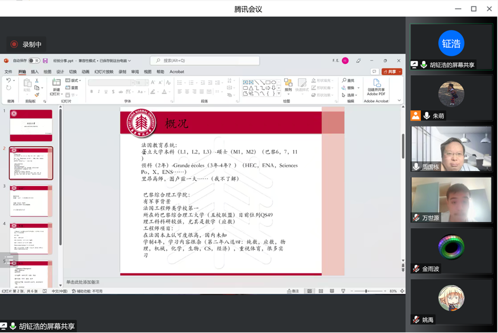 接下来报告的是2019级拔尖班学生、现在巴黎综合理工学院工程师项目就读的胡钲浩。他首先介绍了法国的各种本科和研究生项目,以及综合理工学院的基本情况,讲述了申请、笔试和面试的过程。最后,他还介绍了留学法国的学习和生活开支,以及可以申请的各种奖学金情况。