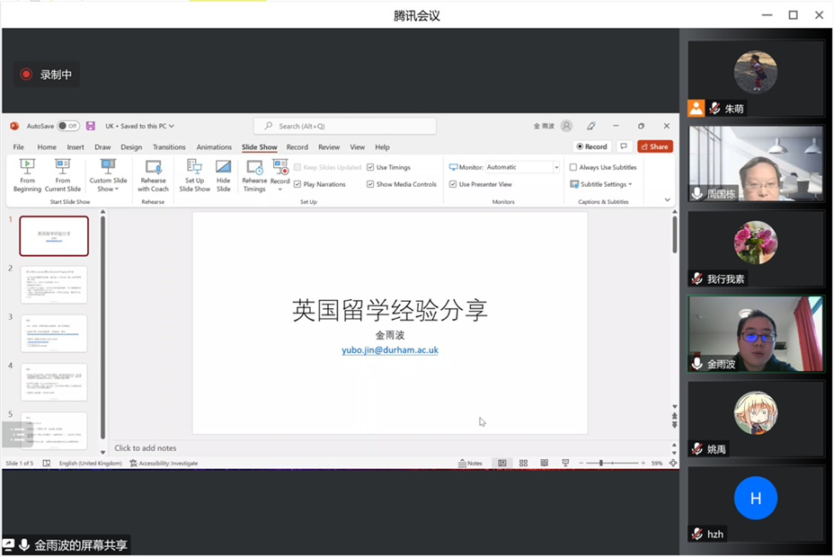 第五位报告人是2020届毕业生、目前在英国Durham University读博的金雨波。他介绍了英国的留学申请流程和所需要准备的材料,然后详细讲解了英国的硕士和博士项目。