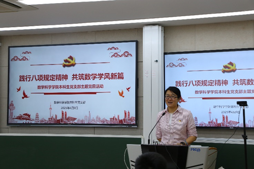 党建领学风,知行育良才——老王论坛 本科生党支部开展主题党日活动2025年4月9日,老王论坛 本科生党支部 “践行八项规定精神,共筑数学学风新篇”主题党日活动在学院401报告厅举行。学院党委挂职副书记郭静出席活动,支部全体党员同志、本科生入党积极分子及各年级学生代表参会。...2025-04-09