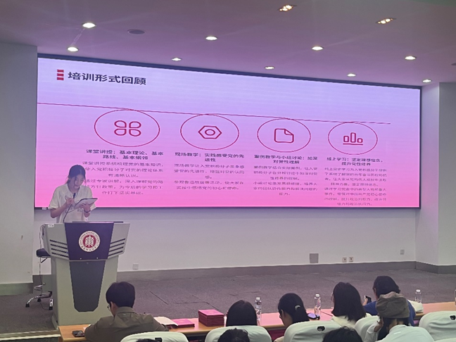 典礼伊始,四个院系的学习小组依次进行了学习成果汇报。各小组代表结合本次培训中的所学所感,从党的基本理论、历史使命以及新时代青年党员的责任担当等方面进行分享,展现了对青年使命的深入思考,汇报内容丰富、形式创新,充分体现了学员们的学习深度与实践探索。