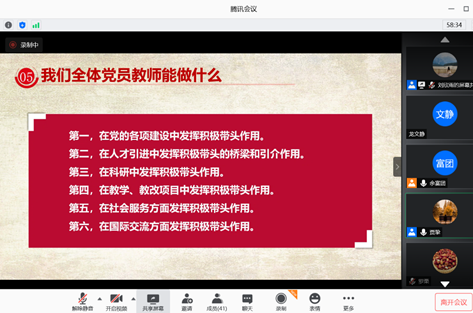 党课伊始,贾挚带领与全体会党员通过网络平台线上参观了中共一大网络纪念馆,回顾了中国共产党成立和发展的历程,追溯了中国共产党的初心和使命来源。她指出,通过云参观回顾这段历史,就是要明白:为中国人民谋幸福,为中华民族谋复兴,是中国共产党人的初心和使命,是激励一代代中国共产党人前赴后继、英勇奋斗的根本动力。她强调,学“四史”,就是要深刻认识红色政权来之不易、新中国来之不易、中国特色社会主义来之不易,要坚定理想信念,增强实现中华民族伟大复兴中国梦的信心,做到信仰如山、信念如铁、信心如磐,努力把老王论坛 建设成为世界一流的以教师教育和教育研究为优势特色的综合性研究型大学,切实践行“建教育强国”和“以教育强国”的办学使命。