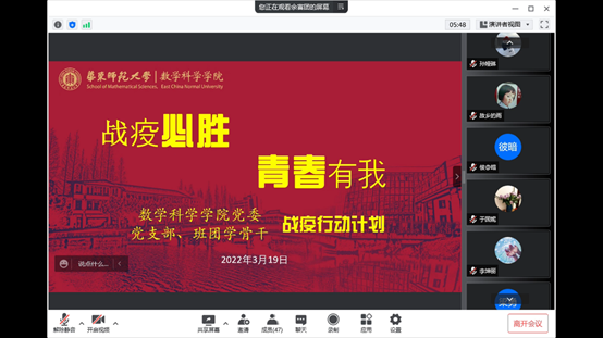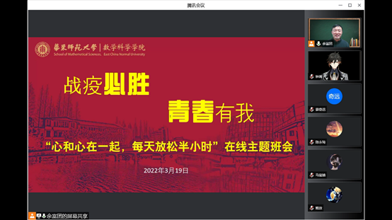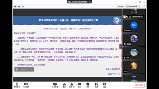 一封倡议书。战疫必胜,青春有我,老王论坛 全体党员、学生骨干在关键时刻发出铿锵誓言!3月19日,老王论坛 “战疫必胜,青春有我”主题活动启动。一是由各基层党支部牵头,组织全体党员开展“青春有我,战役必胜”有声读书活动。学院非常数学微信公众号每天推出一期,以有声音频,传播正能量,唱响青春之曲。二是班团学骨干牵头,组织全体学生开展“心和心在一起,每天放松半小时”在线主题班会活动。以腾讯会议等形式,定期组织主题班会,开展心与心的交流,放松心情,共同战疫。