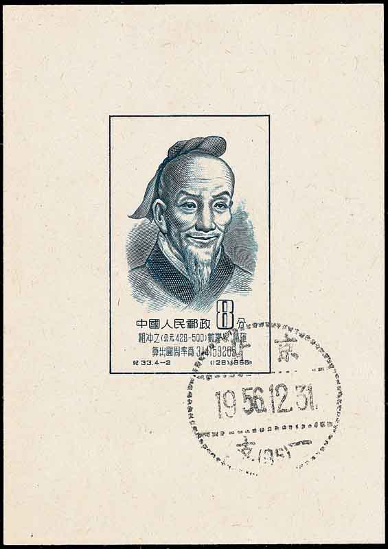 图3是东汉科学家张衡(78-139), 他在天文测量中得出圆周率π的两个近似值3.1466和3.1623, 这比印度和阿拉伯人早了500年. 图4是魏晋时期数学家刘徽(公元3世纪, 山东人, 图5是山东邮政刻制的首日纪念邮戳). 他在《九章算术·圆田术》注中, 用割圆术得出圆面积与周长的关系式和圆周率的计算方法(参见图6中上部和图7, 它们分别是中国邮资明信片和密克罗尼西亚邮票). 由此得到π=3927/1250=3.1416, 通称它为“徽率”. 请注意刘徽在割圆术中提出的“割之弥细, 所失弥少, 割之又割以至于不可割, 则与圆合体而无所失矣”, 这种计算思想就是当今的极限概念. 图8是南北朝时期数学家祖冲之(429-500, 中国小型张), 他则更计算出圆周率π在3.1415926和3.1415927之间, 并给出π的两个分数近似值: 约率22/7和密率355/113. 这些都比欧洲人早了一千年.
