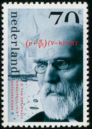 又如荷兰物理学家范德华(J。 D。 van der Waals,1837-1923,图11)从气体分子运动论得出理想气体的状态方程。1881年,他给这个方程引入两个参量, 分别表示分子的大小和引力,从而得出更准确的方程即范德华方程。他在研究物质三态(气、液、固)相互转化的条件时,推导出临界点的计算公式,计算结果与实验结果相符。 正由于他在研究气态和液态方程的突出成绩而获得1910年诺贝尔物理学奖。
