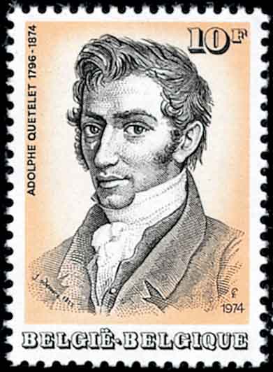 比利时统计学家阿道夫·凯特勒(Adolphe Quetelet,1796-1874,图3是纪念凯特勒逝世100周年邮票)利用概率性的概念来描述社会学和生物学现象。他认为那些在表面上看似乎杂乱无章的、 偶然性占统治地位的社会现象,如同自然现象一样也具有一定的规律性。他认为统计学不仅要记述国情和社会的静态现象,还要研究社会生活的动态,研究社会现象背后的规律性。凯特勒的这一思想为近代统计学的科学化奠定了基础。