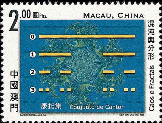 1883年德国数学家康托尔(Georg Cantor, 1845-1918)给出一种点集(图2): 一条直线, 三等分后舍去中间一段。对余下的两段同样三等分后舍去中间一段。无限反复上述工作, 得到我们现在称之为的康托尔集。它是测度为0的不可列点集。容易看到它是自相似的图形。