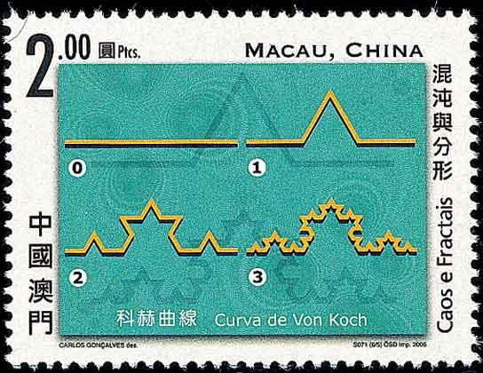 瑞典数学家科赫(Helge von Koch, 1870-1924)于1904年也提出一个处处连续但处处不可微的例子。其构造方法是: 在一条直线段(图3中0)上作三等分, 取中间一段为底作向上正三角形, 删去这个正三角形的底边, 这时直线段变成由4条小直线段连结而成的折线(图3中1), 对每条小直线段作三等分, 取中间一段再作向外的正三角形(图3中2), 继续上述工作得图3中3, 无限进行下去, 就得到一个处处连续但处处不可微的例子。如果对某一正三角形的每一边, 都按照上述方法操作, 则得到一个雪花图案, 也称为科赫雪花(图4是科赫雪花的绘制过程)。(待续)