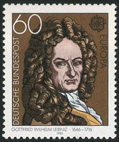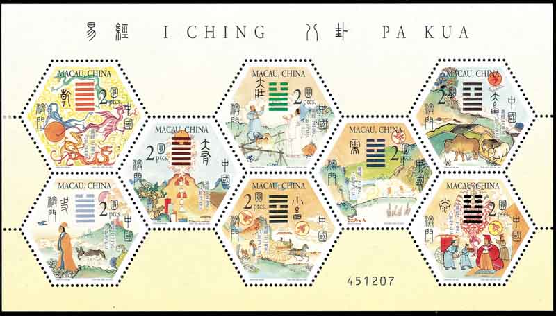 西方认为,二进位制是德国科学家莱布尼茨(Leibniz,1646-1716,图3)发明的。其实二进位制在中国早有记载。它表现在八卦中,相传八卦是伏羲所造, 图4是中国澳门邮票,它的画面是“伏羲画卦图”。八卦就是由长短划不同排列组合而成的符号。每一卦都由阳爻(—)和阴爻(- -)构成。如果分别记它们为1和0, 那么由图5(中国澳门邮票),看到第一卦乾卦 1111112 换算成十进制是 25+24+23+22+21+20=63, 下面依次是 0111112=31, 1011112=47,0011112=15, 1101112=55, 0101112=23,1001112=39, 0001112=7。