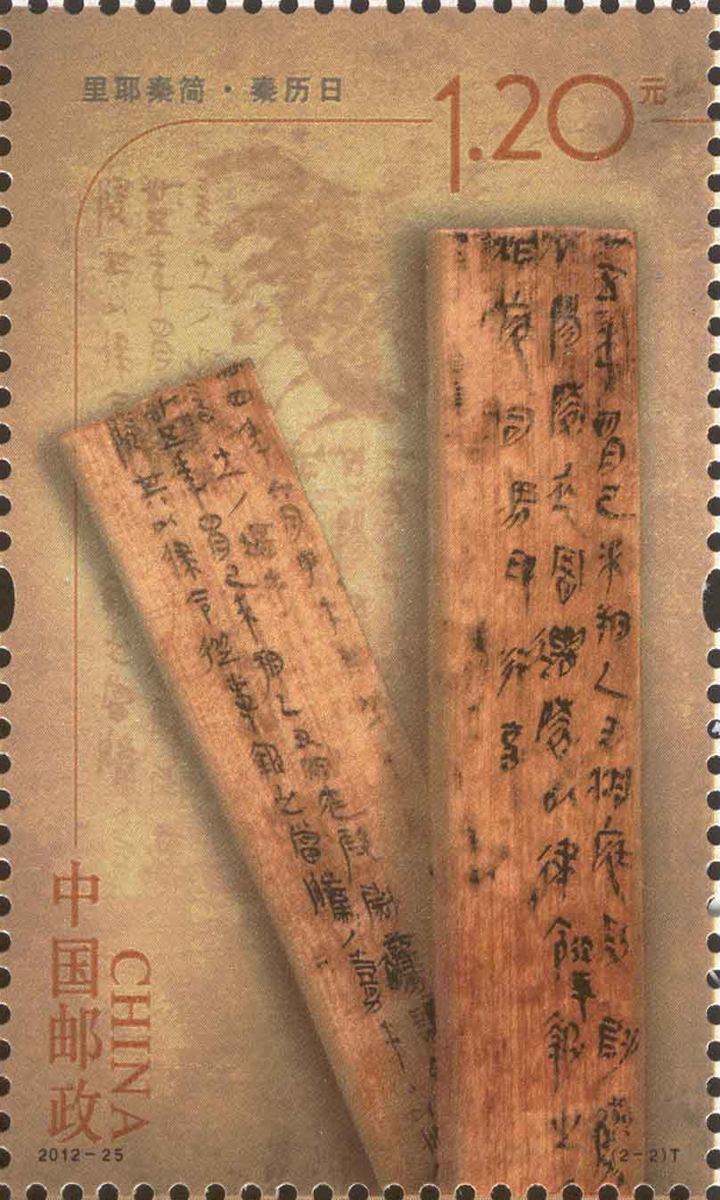 2012年9月13日中国邮政发行一套票名为《里耶秦简》的特种邮票。这套邮票有两枚,分别是“乘法九九口诀”(图1)和“秦历日”(图2)。 这是2002年6月在湖南湘西龙山县里耶镇里耶古城出土的秦简。这批秦代简牍,从秦王政二十五年至秦二世元年(前222-前208),共有3万7千多枚。 简牍内容涉及秦代政治、军事、赋税、财政、文化、职官、算术、历法等等各个方面。中国邮政当局选择其中两枚通过邮票的形式向大家展示。这两枚邮票应该说都是与数学有关, 尤其是第一枚“乘法九九口诀”,是目前世界上最早、最完整的乘法口诀表实物。