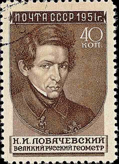 非欧几里得几何的诞生有着许多富有故事性的曲折过程. 首先是历史上好些数学家提出, 欧几里得几何的第五公设 (平行公理: 若一直线与两直线相交, 所构成的两个同侧内角之和小于直角, 则这两直线的延长线一定在那两内角侧相交.) 能不能不作为公设, 而作为定理? 或者说能不能依靠前四个公设来证明第五公设? 因为这个公设从语句上看像是个可以证明的定理. 许多年来, 人们投入了无数的精力, 尝试了各种可能的方法, 但都未能成功. 这就是几何发展史上著名的关于``平行线理论''的研究. 俄罗斯数学家、 喀山大学校长罗巴切夫斯基 Николай Иванович Лобачевский, (1792--1856), 图1和图 2 分别是前苏联 1951 年和 1956 年发行的纪念罗巴切夫斯基的邮票) 从 1815 年起着手研究平行线理论. 开始他也是循着前人的思路, 试图给出对第五公设的证明. 但他很快就发现这条路走不通. 并推理出: ``第五公设不能被证明''的重要结论. 与此同时他创建一个新的平行公理, 即: 通过直线外一点至少有两条直线与已知直线平行. 它与欧几里得几何其他四个公理一起构成新的公理体系, 形成了新的理论, 它也和欧几里得几何一样是完善的、严密的几何学, 被世人称为罗巴切夫斯基几何. 1826 年 2 月 23 日, 罗巴切夫斯基在喀山大学物理数学系学术会议上, 宣读了他的论文: 《几何学原理及平行线定理严格证明的摘要》. 这篇创造性论文的问世, 标志着非欧几里得几何的诞生. 然而, 这一重大成果在公诸于世时, 遭到当时许多传统数学家的冷漠和反对, 甚至遭到匿名者的攻击, 但他仍然继续探索新几何的奥秘. 并于 1829 年, 在《喀山大学通报》发表了题为《几何学原理》的论文. 这篇论文重述了第一篇论文的基本思想, 并作了补充和发展.