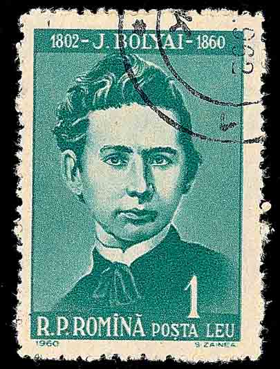 这时匈牙利青年数学家鲍耶·雅诺什 (Bolyai Janos, 1802-1860, 图 2 和图 3 分别是匈牙利和罗马尼亚在 1960 年为纪念鲍耶·雅诺什逝世 100 周年发行的邮票) 虽然遭到父亲 — 数学家鲍耶·法尔斯 (Bolyai Farkas, 1776-1856, 图 4 是匈牙利 1975 年发行的纪念鲍耶·法尔斯诞生 200 周年邮票) 的反对, 仍然致力于第五公设的研究, 终于发现了第五公设不可证明和非欧几里得几何学的存在, 并在 1823 年写成论文《空间的绝对科学》. 鲍耶·法尔斯将它寄给他的好朋友高斯, 希望得到他的赞许并公诸于世. 但高斯在赞扬雅诺什勇于探索精神的同时, 还说这与我 30 年前的工作不谋而合. 我无法夸奖他, 因为夸奖他就等于夸奖我自己. 这使鲍耶·雅诺什极为失望, 一直到 1832 年才在他的父亲的一本著作里, 以附录的形式发表这个研究成果. 但当他于 1840 年看到罗巴切夫斯基论文的德文版后就更加灰心丧气了.