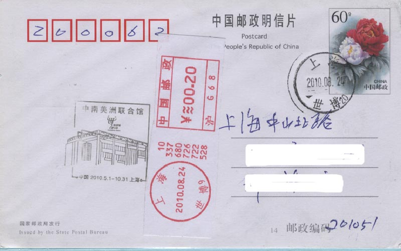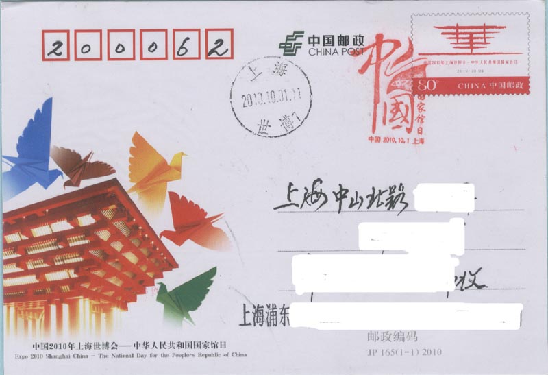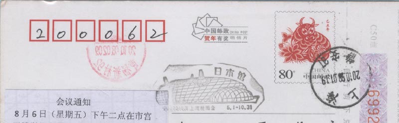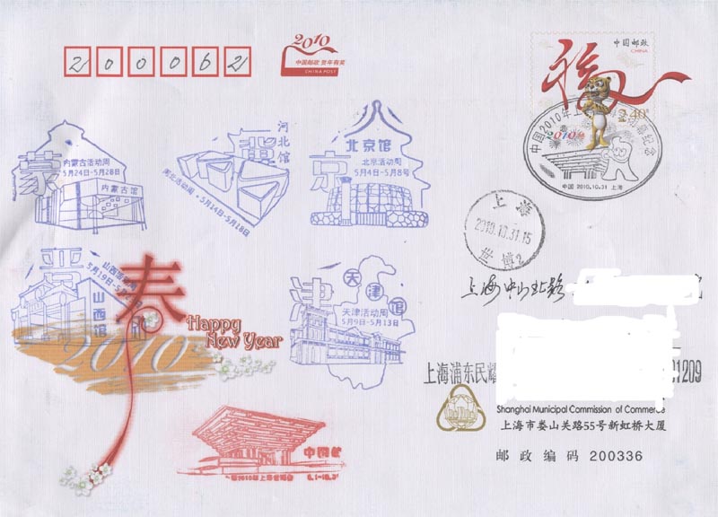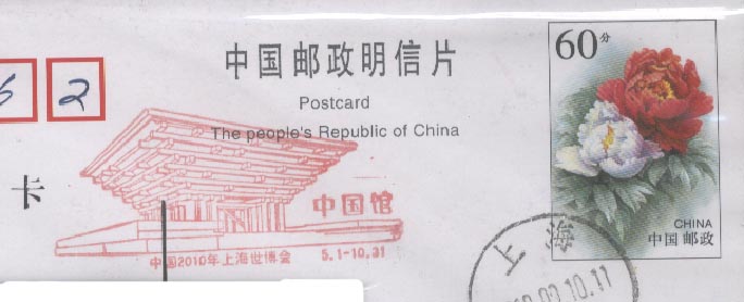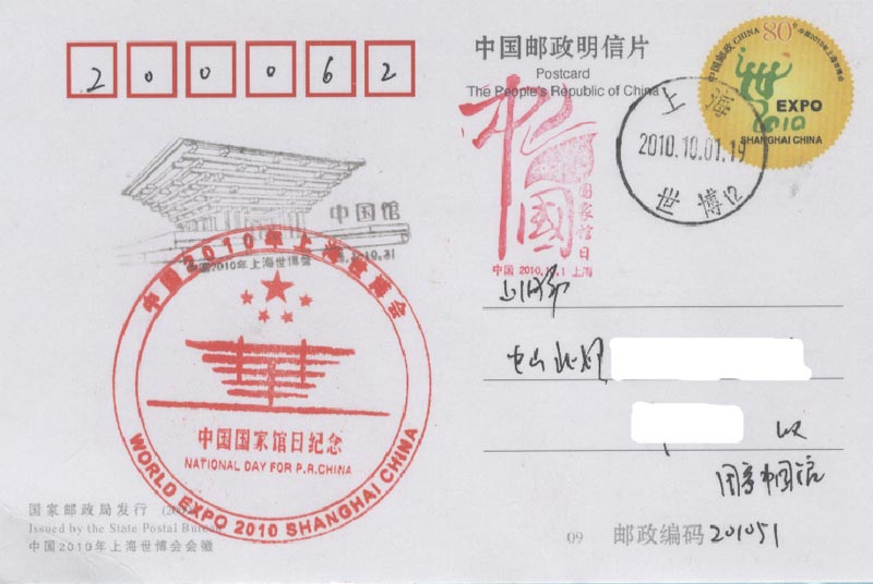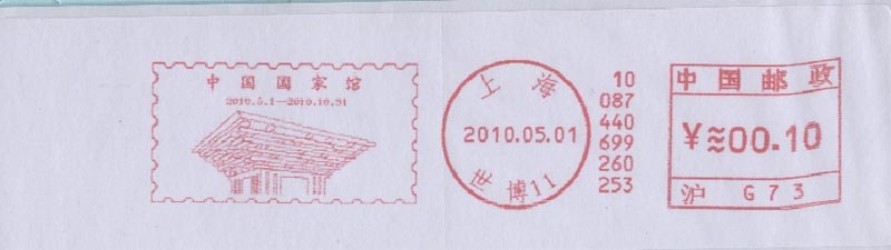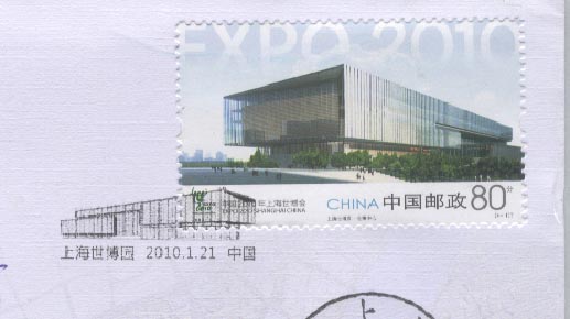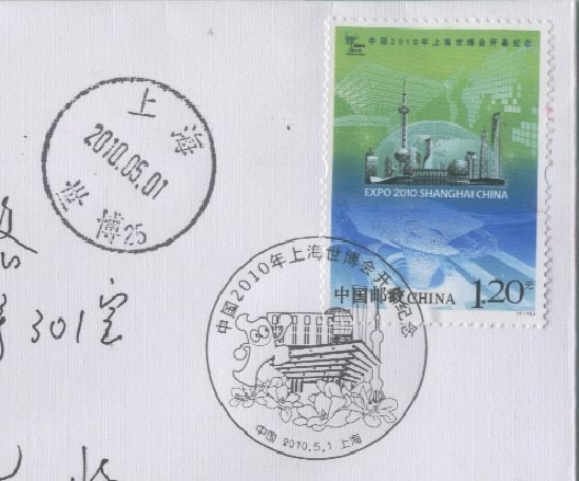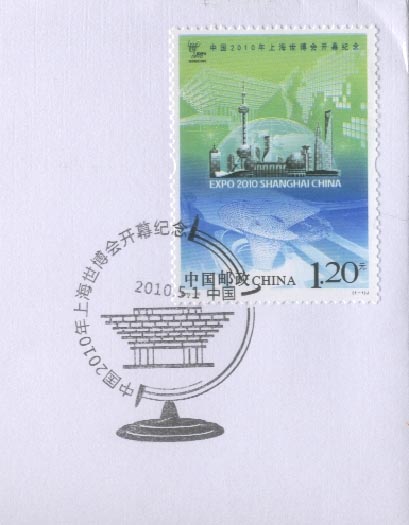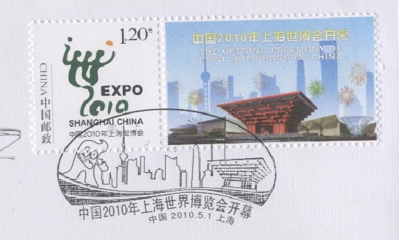 中国2010上海世界博览会于2010年4月30日晚上举行盛大的开幕仪式(图22),5月1日早上正式开园(图23)。为此, 中国邮政发行一枚纪念邮票和各种纪念邮戳(图24)