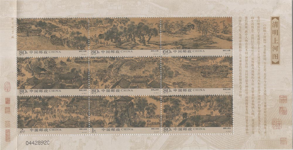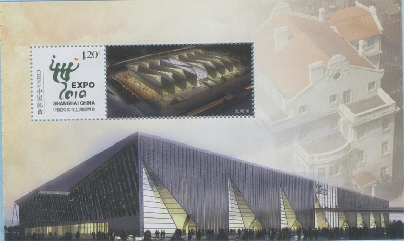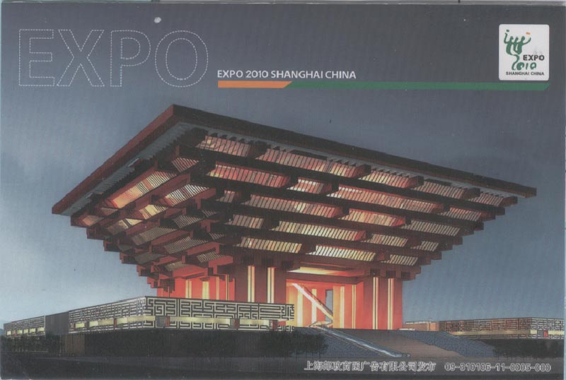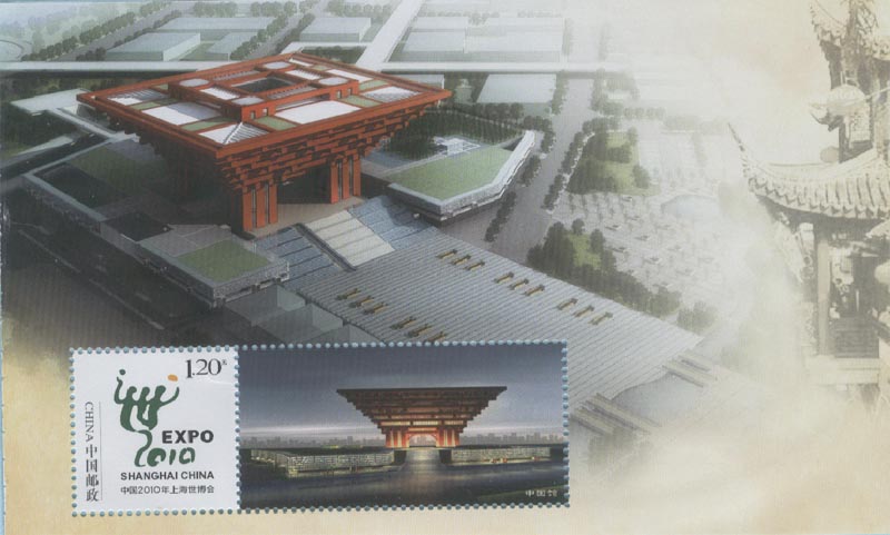 在上海世博园区中最受欢迎的场馆是中国国家馆(图25、26、27),她凝聚中国元素,象征中国精神的造型---东方之冠。它展示的主题是“城市发展中的中华智慧”。 在中国国家馆相继展出的中国国宝有:北宋画卷《清明上河图》(图28)和《秦始皇陵兵马俑》(图29)等等。尤其是数字版的《清明上河图》,让观众惊叹不已。 10月1日是中国馆日,中国邮政发行了一枚邮资明信片及相关的纪念邮戳(图30)。