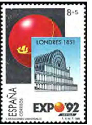 在1989年2月19 日发行一套四枚附捐纪念邮票以回顾过去的世博会,其画面分别是:1851年伦敦世博会水晶宫(图19);1889年巴黎世博会埃菲尔铁塔; 1958年布鲁塞尔世博会原子塔和1970年大阪世博会纪念塔。