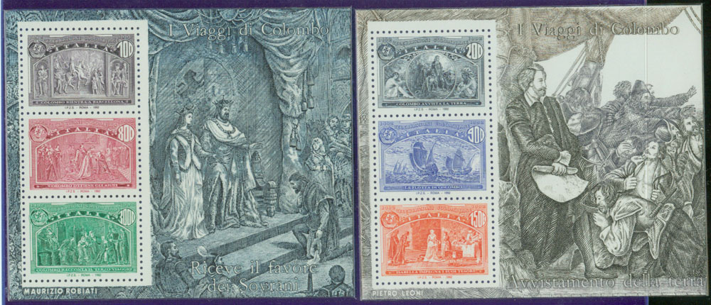 1992年5月22日西班牙与美国、葡萄牙、意大利等四国又同时联合发行同图6枚纪念小型张。 下面图27是意大利的那一套(四套中意大利这一套目前价格最高,约35美元)。